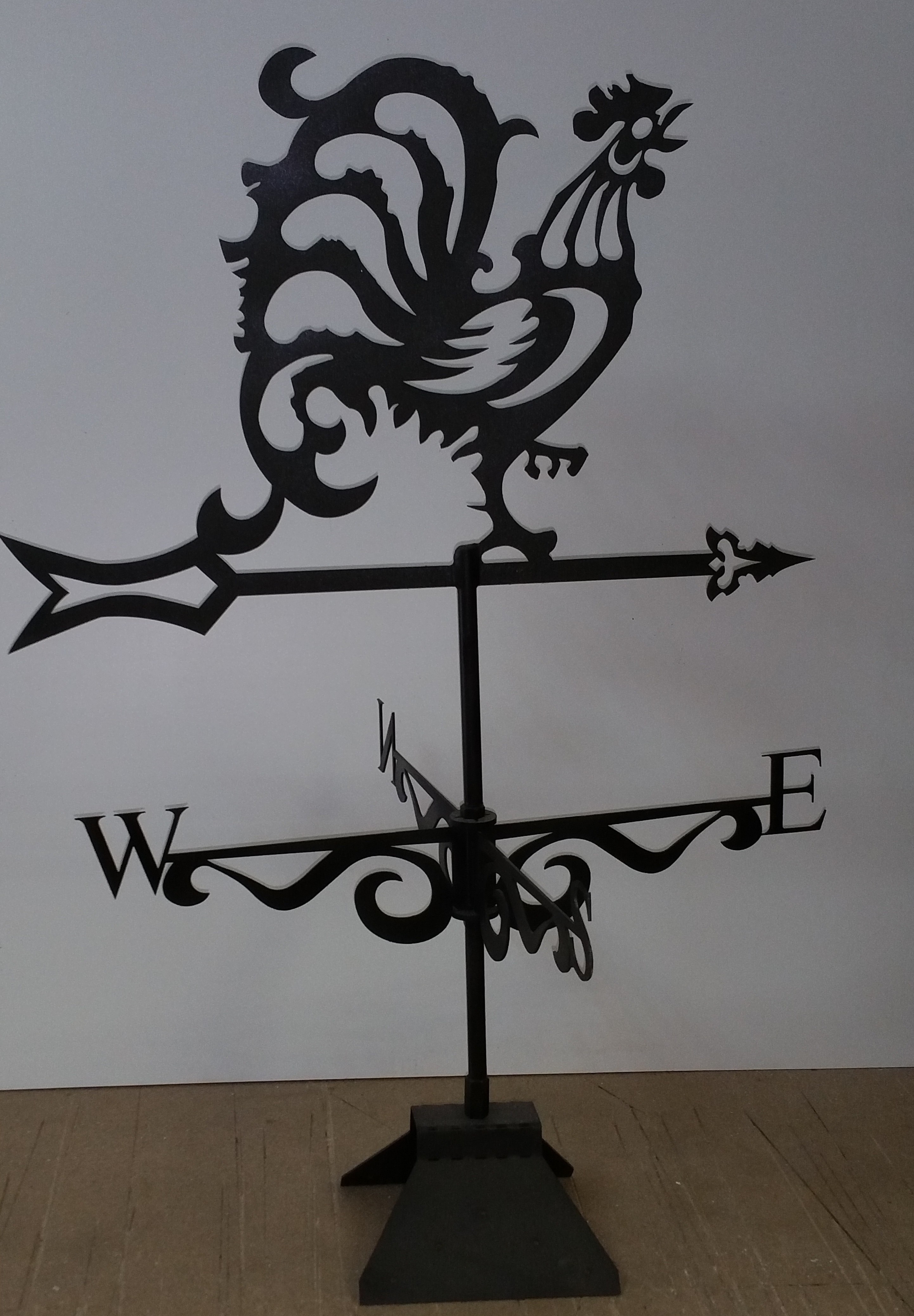 Классической фигурой флюгера и наиболее распространенной является изображение герба, фирменного стиля мастера либо владельца дома, а также, какого либо магического животного или петуха, указывающего направление ветра. Состоит из стойки, розы ветров с указателем сторон света и собственно флюгерки . Устройство такого флюгера очень простое и одновременно надежное: металлический шпиль, в основе всей конструкции, прикрепленный в основании к коньку кровли дома или к дымоходу, с установленным на оси фигурой-указателем. При этом ось вращения должна быть установлена строго вертикально, а флюгер – свободно вращаться от малейшего дуновения ветра.
