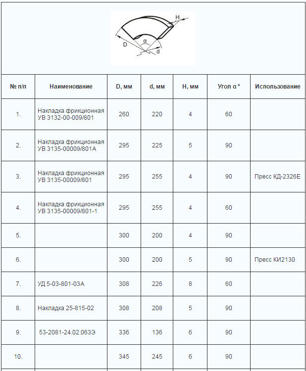 Накладки фрикционные секторного типа для кузнечно-прессового оборудования